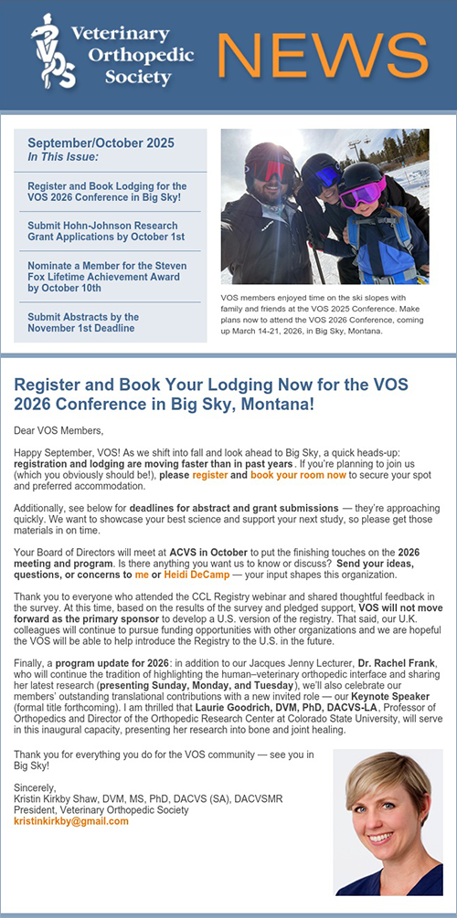 Find out what’s happening at the Veterinary Orthopedic Society by subscribing to our email newsletter and reading recent issues. Click on the button at right to sign up for the VOS newsletter. You will be able to unsubscribe at any time using links provided in each newsletter.